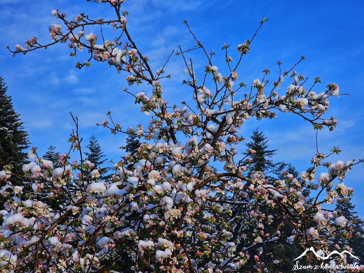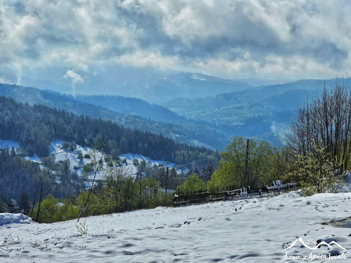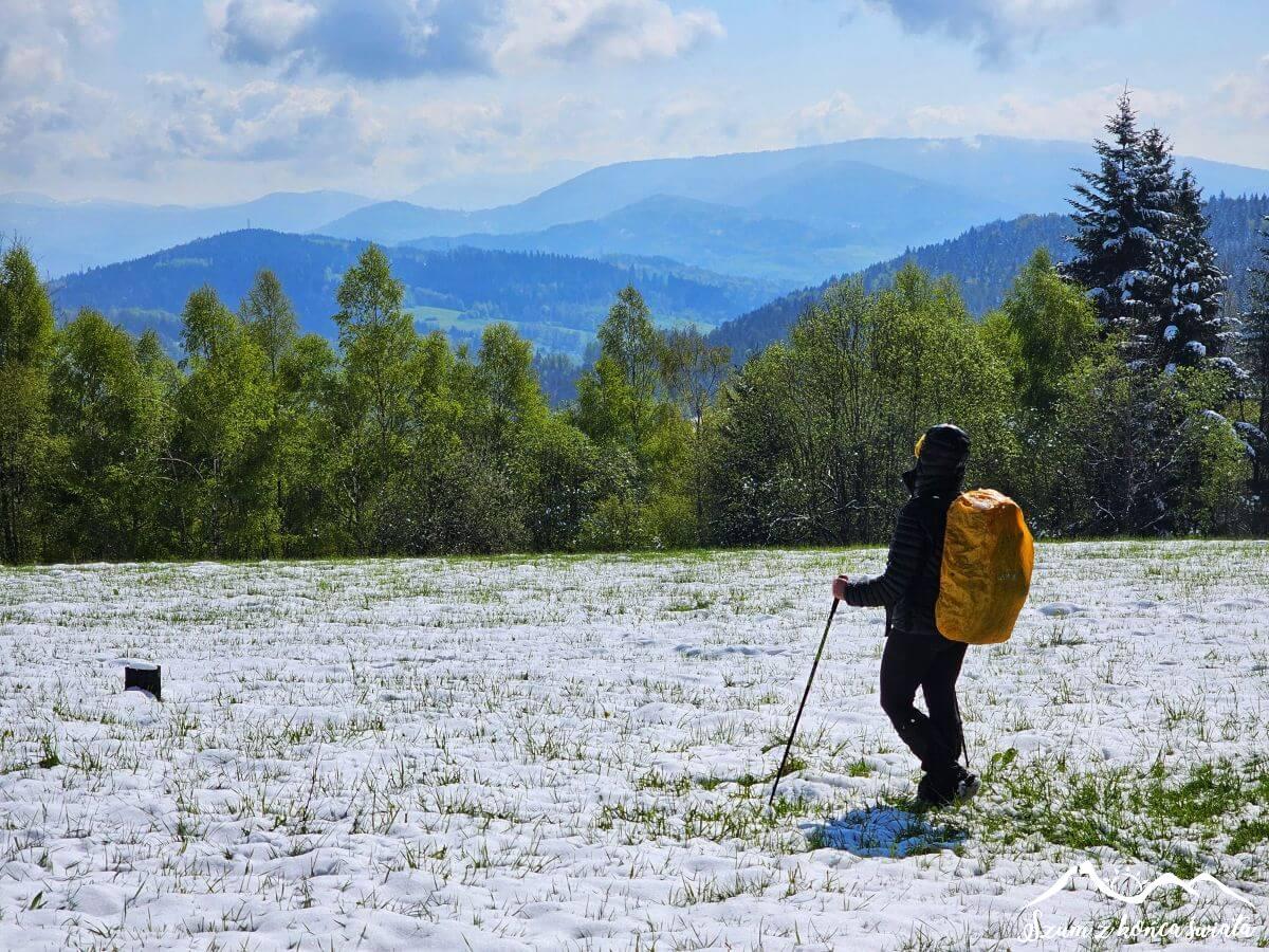 Wstajemy o 5 rano, bo dziś mamy do przejścia ponad 30 kilometrów, z ponad 1400 metrami przewyższeń. Spory wysiłek, a gdy do tego patrzymy za okno, to już wiemy, że… sucho dziś nie będzie. Drzewa wprost uginają się od śniegu, a świeżo wyrosła trawa całkowicie pokryta jest białym puchem. Przypominamy, że jest 25 kwietnia, a my nie chodzimy po Tatrach! Na termometrze nieco poniżej 0°C, więc na szybkie topnienie nie ma co liczyć. Na szczęście po porannej szarówce nieśmiało zaczyna przebijać się słońce, które będzie dziś naszym sprzymierzeńcem.