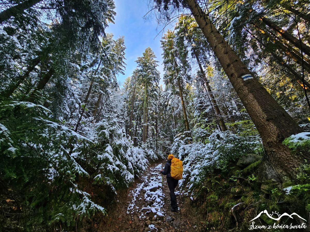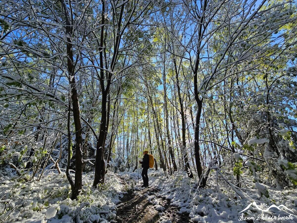 Mamy jednak świadomość, że to, co dla nas jest atrakcją, dla roślin jest sporym problemem. Widać to też na szlaku, który co chwilę zagrodzony jest drzewami uginającymi się pod ciężarem śniegu. Przedzieramy się przez nie niczym przez amazońską dżunglę. Dodatkowo topniejący śnieg tworzy coś na kształt deszczu, przez co już za chwilę zmagamy się z problemem mokrej odzieży.