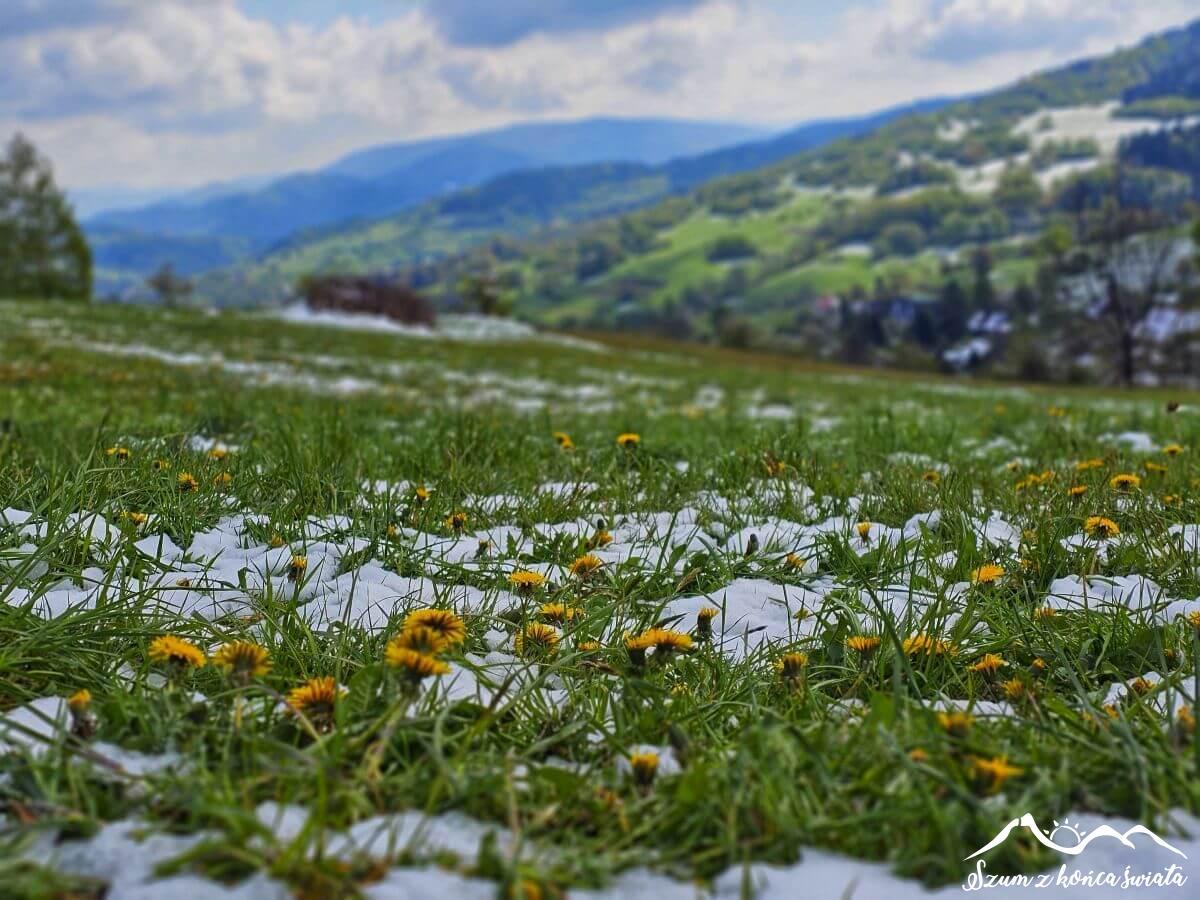 O 7 opuszczamy nasz przytulny nocleg i ruszamy prosto na Koskową Górę – przed nami ponad 300-metrowe podejście. Krajobraz po nocnych opadach śniegu jest absolutnie magiczny – wszechobecna biel walczy z kolorową wiosną. Do tego poranne słońce przebija się przez nieliczne szczeliny pozostawione przez drzewa – jest pięknie!