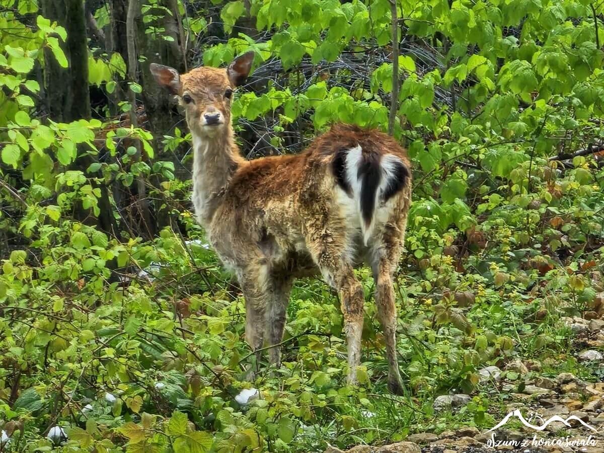 Nasz marsz umilają jednak widokowe polanki, z których podziwiamy szczyty Babiej Góry, Policy i naszego dzisiejszego celu – Lubonia Wielkiego. Do tego cieszą nas spotkania z danielem i dużym stadem (chyba) saren.