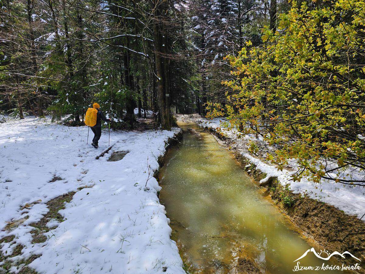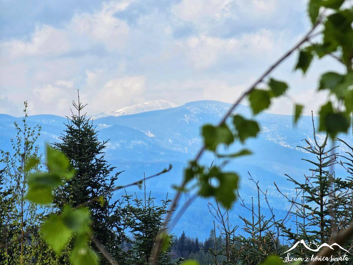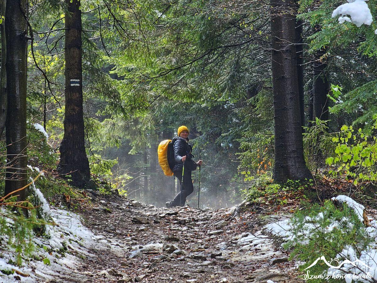 Kolejne kilometry to praktycznie kopiuj-wklej. Topniejący śnieg lecący z góry, kałuże, ośnieżone drzewa tarasujące przejście, a do tego zejście do drogi, by zaraz podejść na kolejny szczyt. Taki urok przecinania kolejnych pasm Beskidu Makowskiego, które ułożone są z zachodu na wschód, podczas gdy my wędrujemy z północy na południe.