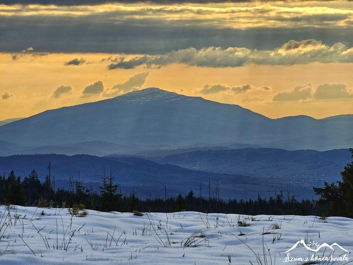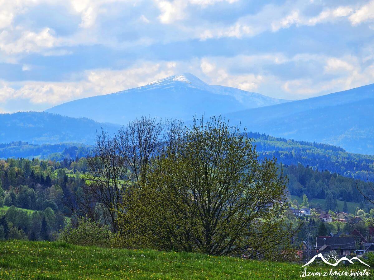 Olszówkę mijamy bez zatrzymywania się i suniemy prosto na Porębę Wielką – dobrze nam znaną, bo właśnie tutaj spędzaliśmy ostatniego Sylwestra. Pośpiech jest wskazany, bo Martyna nie czuje się za dobrze i chętnie odwiedziłaby toaletę. Do niej jednak jeszcze kawałek, a droga do Poręby raczy nas widokami na Gorce i Masyw Turbacza z prawej oraz Beskid Wyspowy z górującą Mogielicą z lewej. Najwyższe partie gór ewidentnie pokryte są śniegiem, dlatego już wiemy, że dzisiaj jeszcze trochę w nim pobrodzimy.
