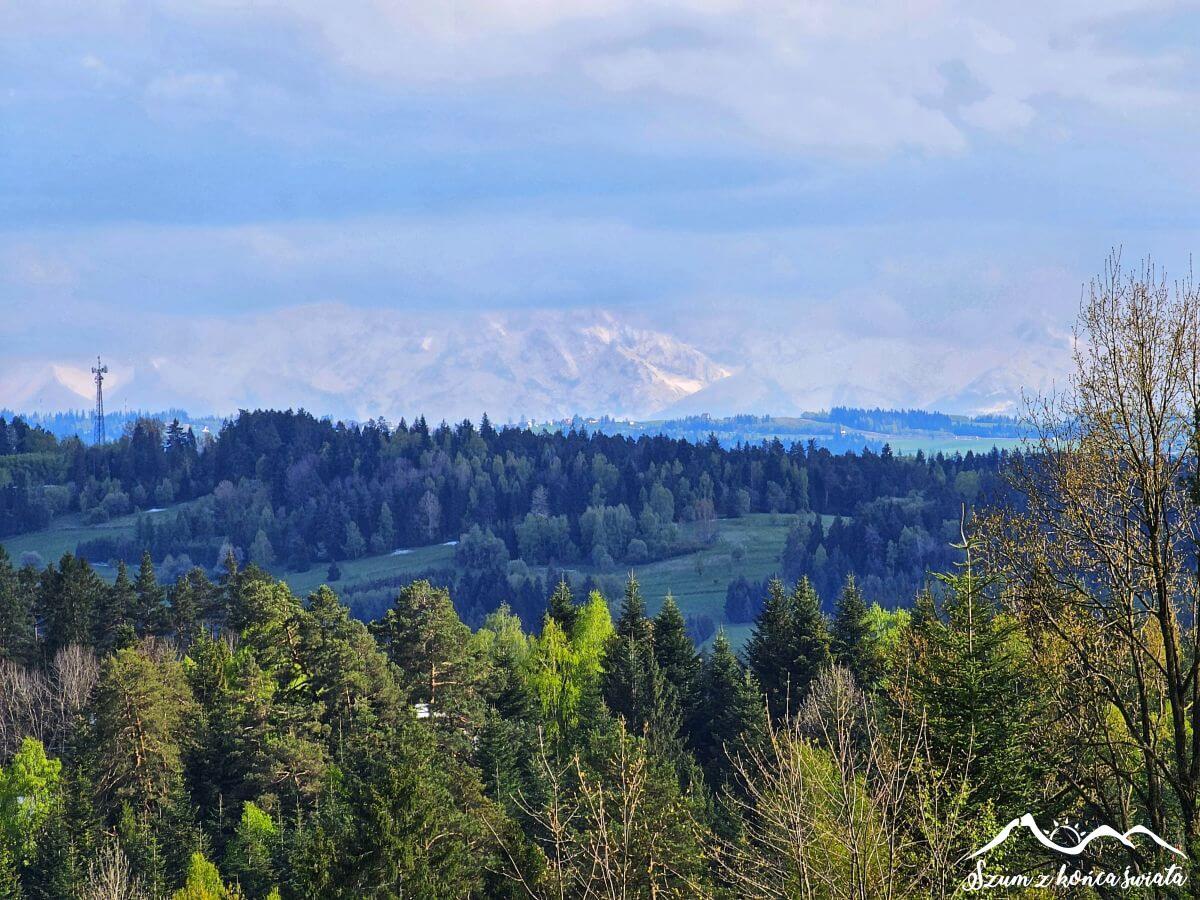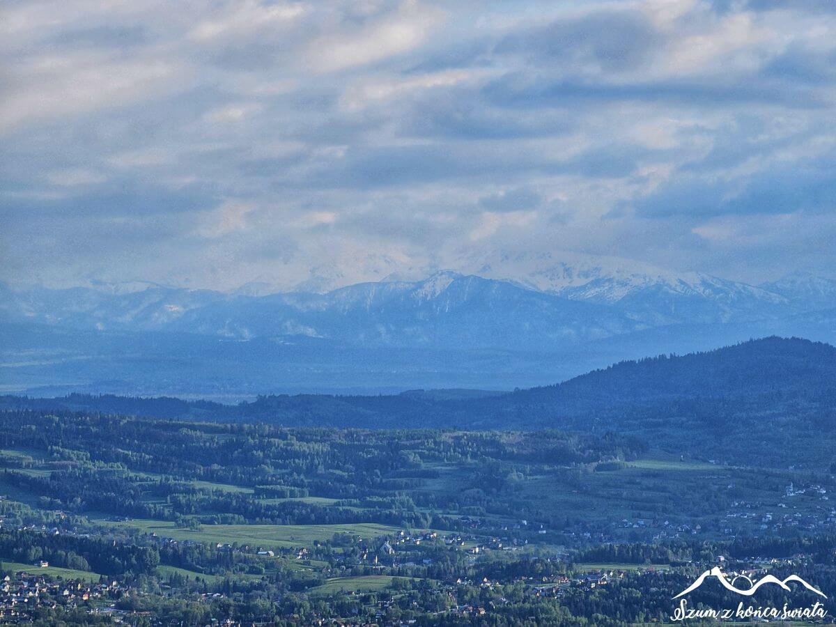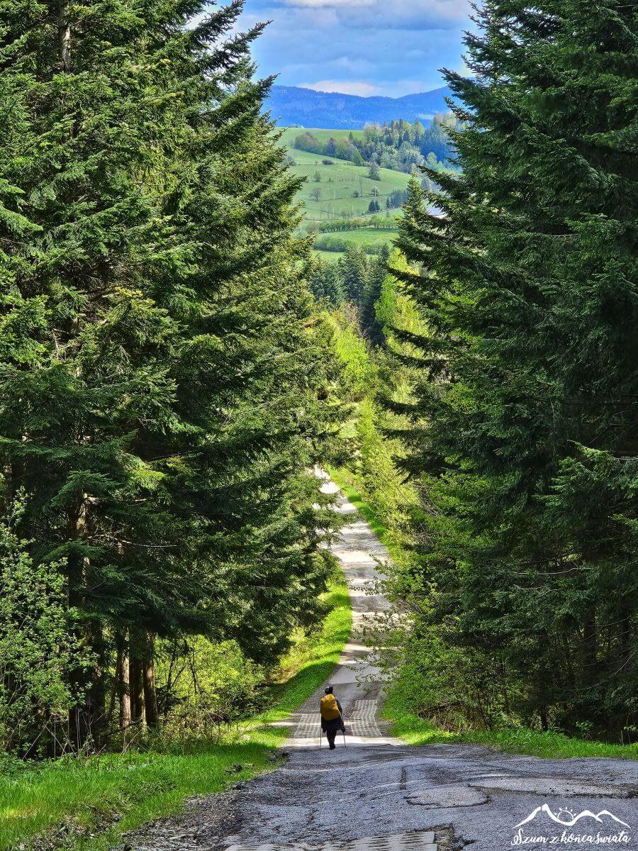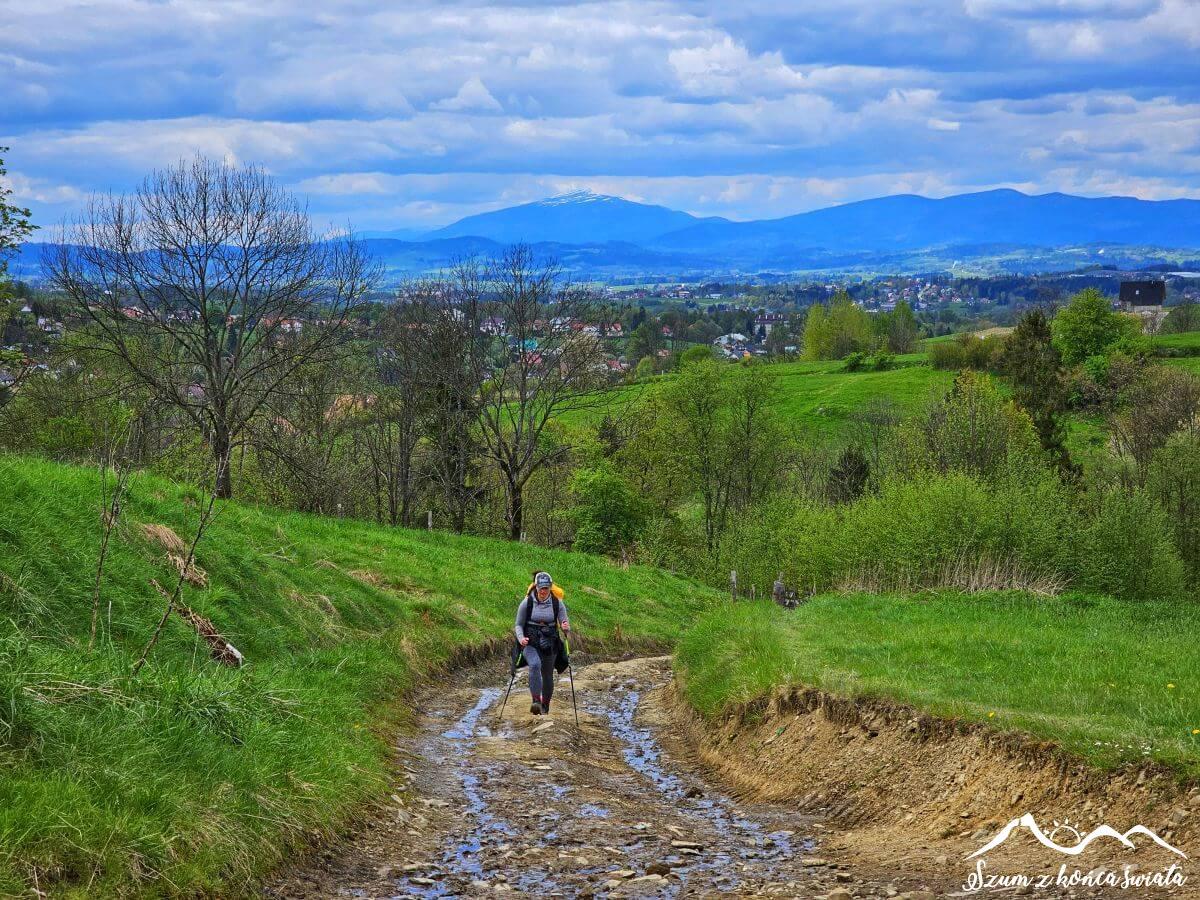Za naszymi plecami króluje Babia Góra, natomiast po prawej stronie zza chmur wychylają się tatrzańskie wierzchołki. Widoczność nadal nie jest jednak zbyt dobra, dlatego napieramy dalej. Tatry zdecydowanie nam nie uciekną. Wędrując skrajem lasu, osiągamy dawną Zakopiankę, która teraz jest praktycznie pusta. Kilkaset metrów jej poboczem i uciekamy w boczną drogę, tym samym meldując się w Beskidzie Wyspowym.