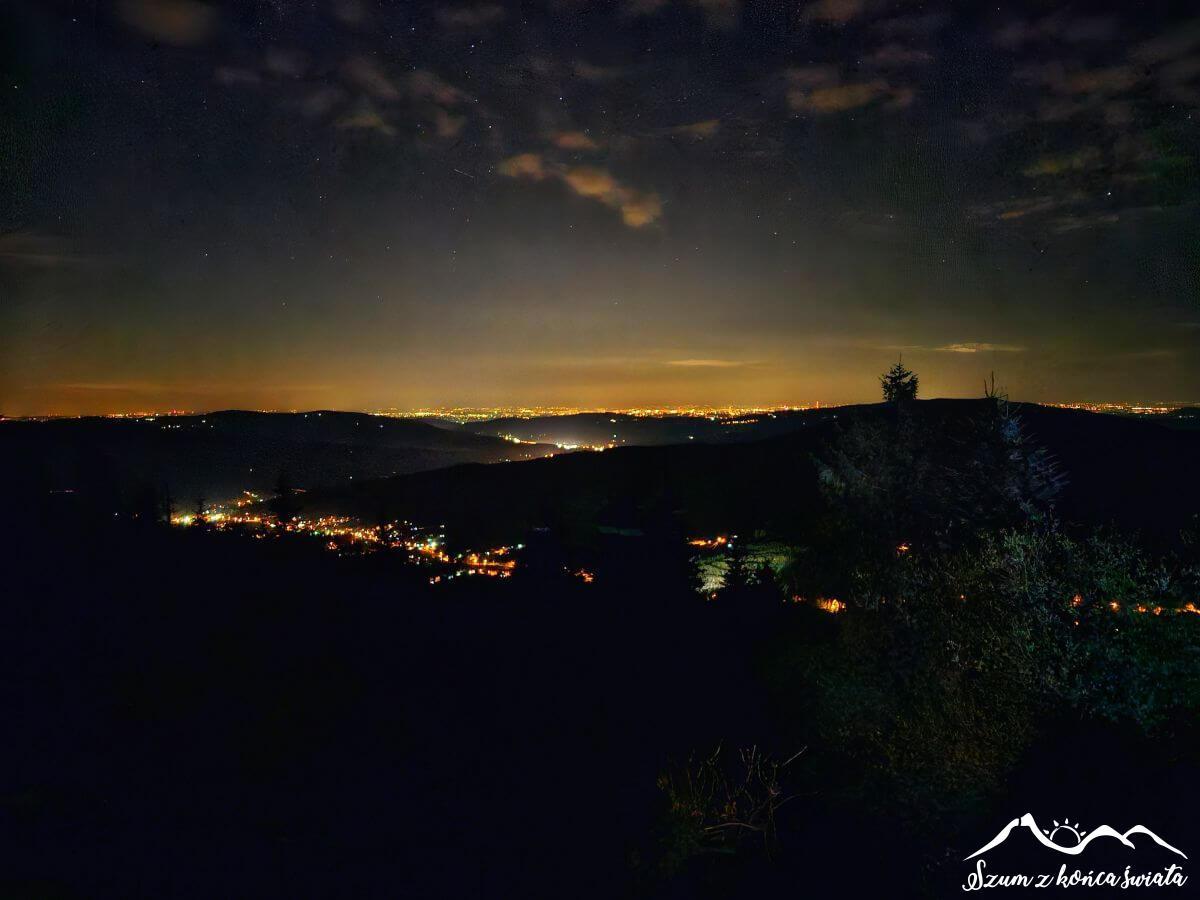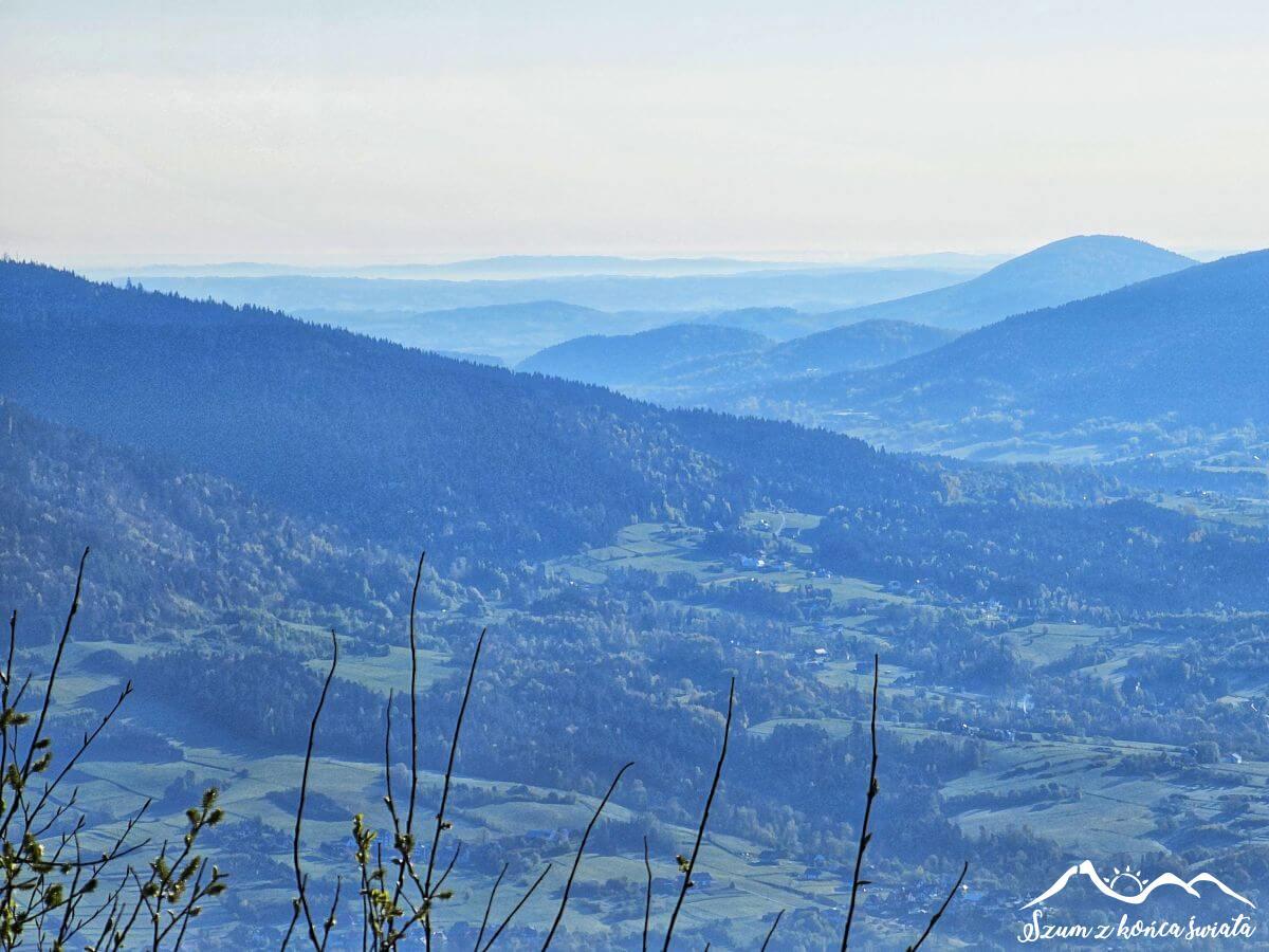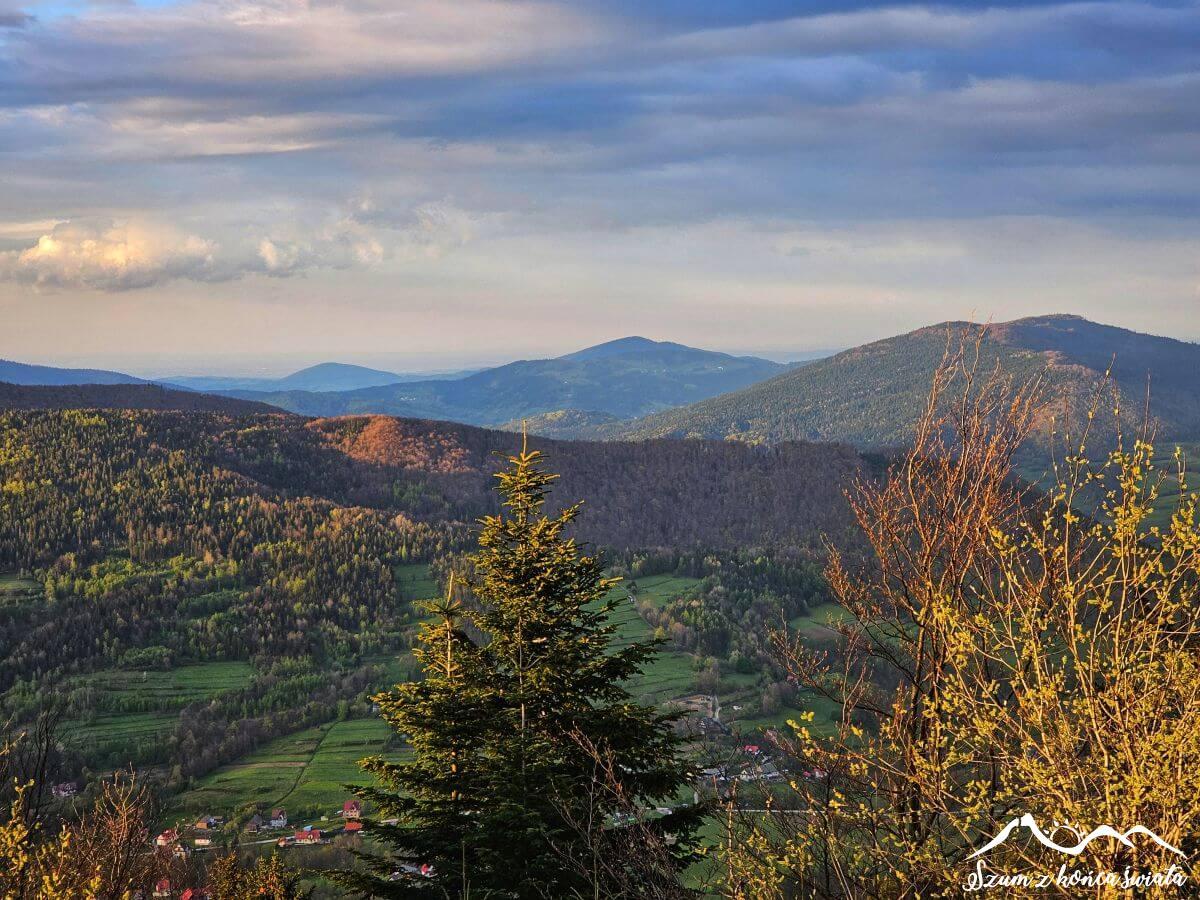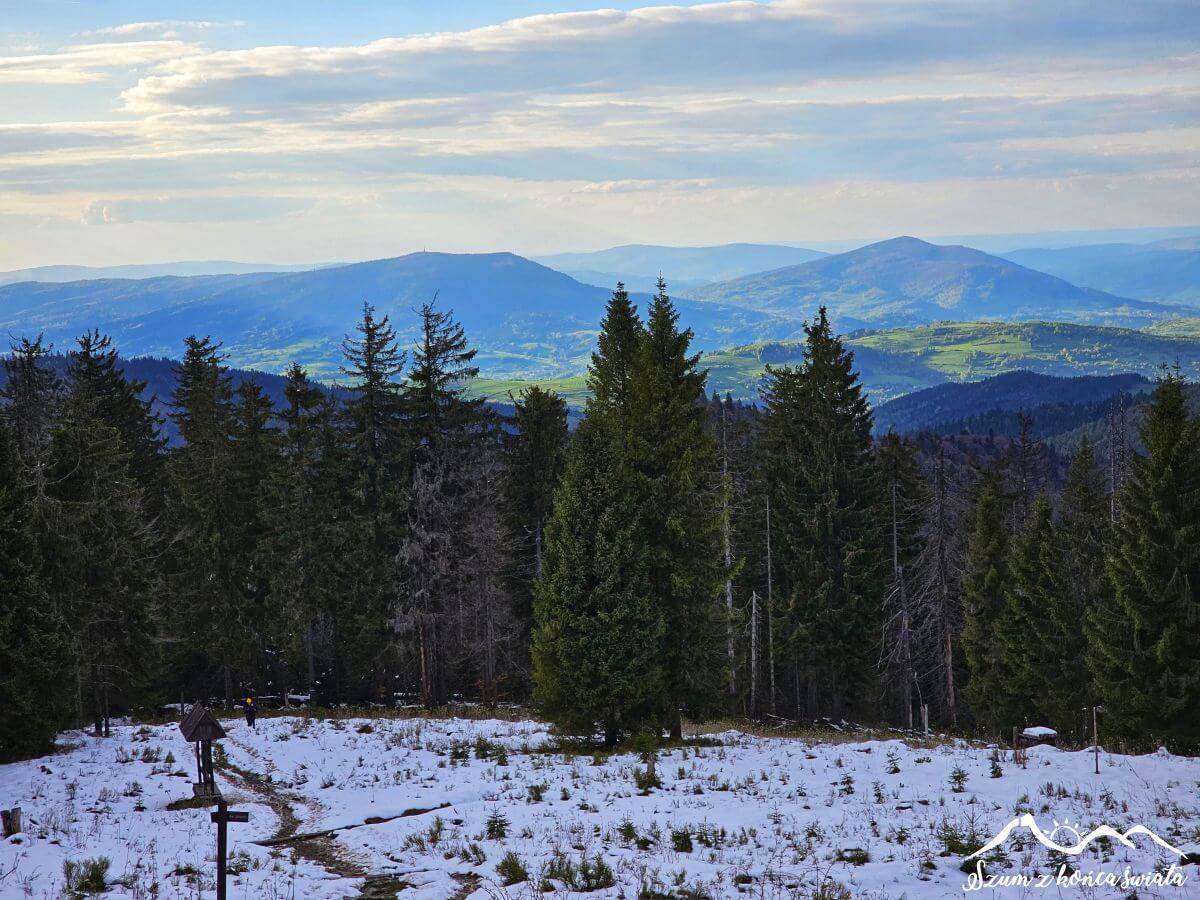 Trud jednak dosyć szybko zostaje wynagrodzony. Osiągamy polanę pod szczytem i naszym oczom ukazuje się przepiękna beskidzka panorama, nieco tylko zmącona na dalszym planie chmurami. I te właśnie chmury złośliwie zasłaniają nam Tatry. Ale co się odwlecze…