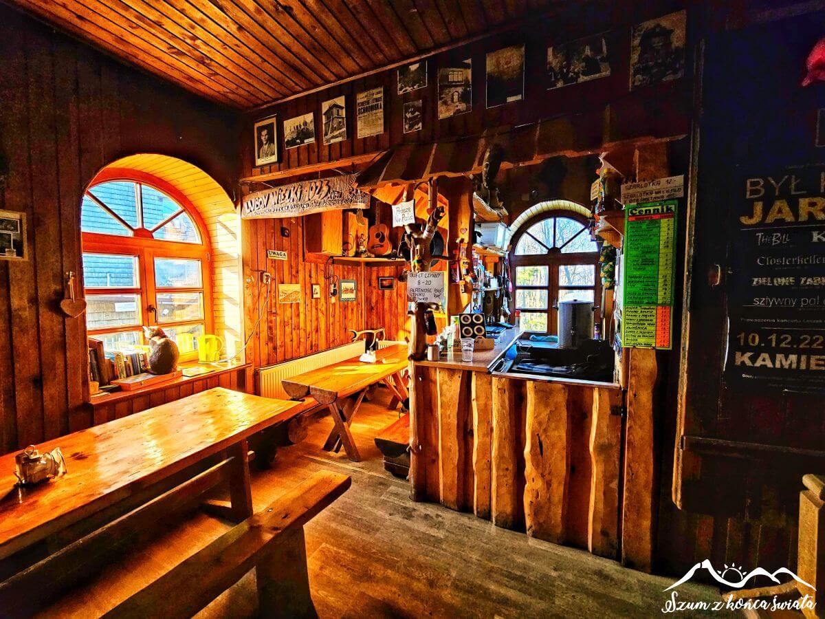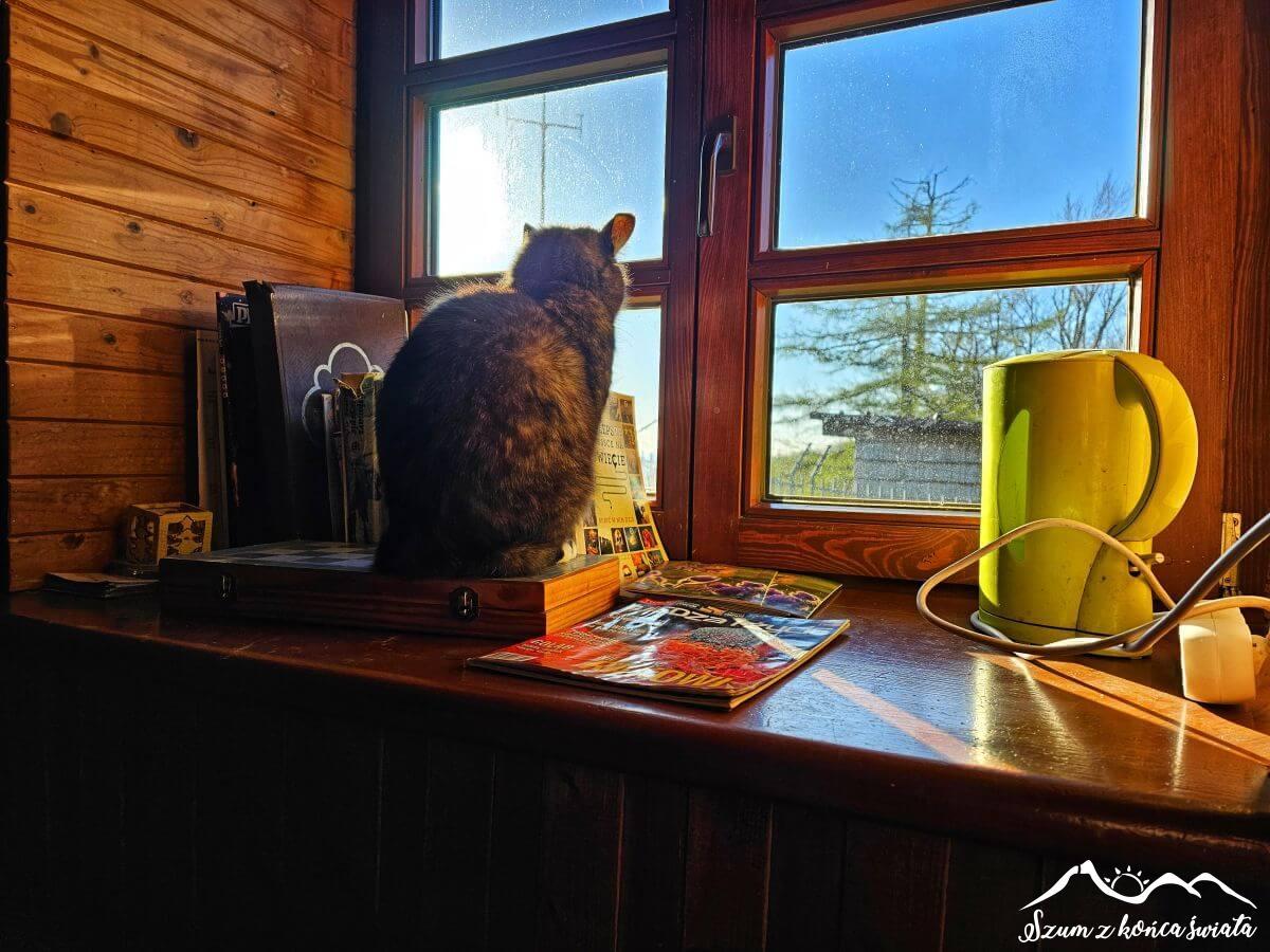 Dzisiaj schronisko oferuje brak prysznica, toalety (są sławojki) i salę noclegową, z której możemy podziwiać widok 360° – szczególnie w okresie zimowym, gdzie liście drzew nie przesłaniają części krajobrazu. Bajka! Jest też bufet, w którym można zamówić ciepły posiłek, ugasić pragnienie i pogłaskać schroniskowego kota. Takie miejsca sprawiają, że bardzo szybko ładujemy zużyte baterie.