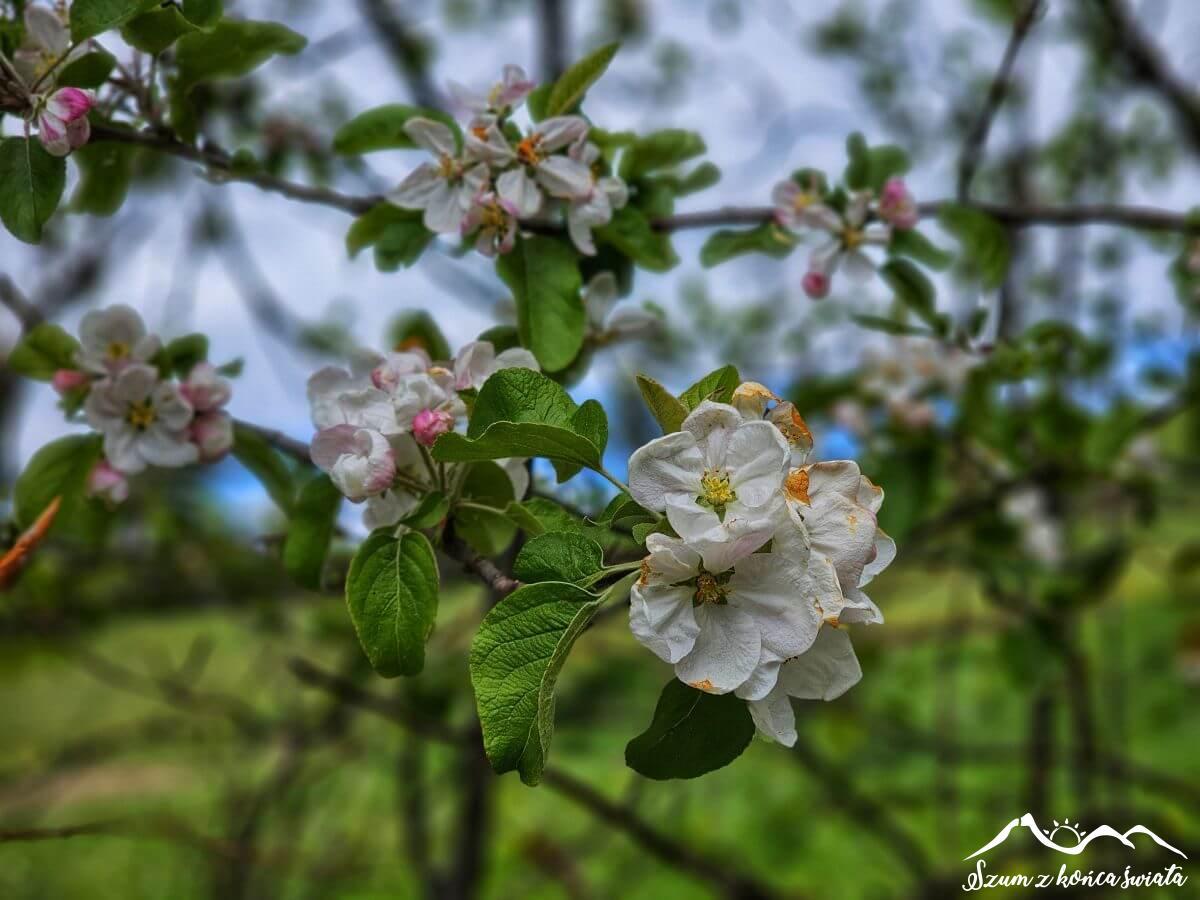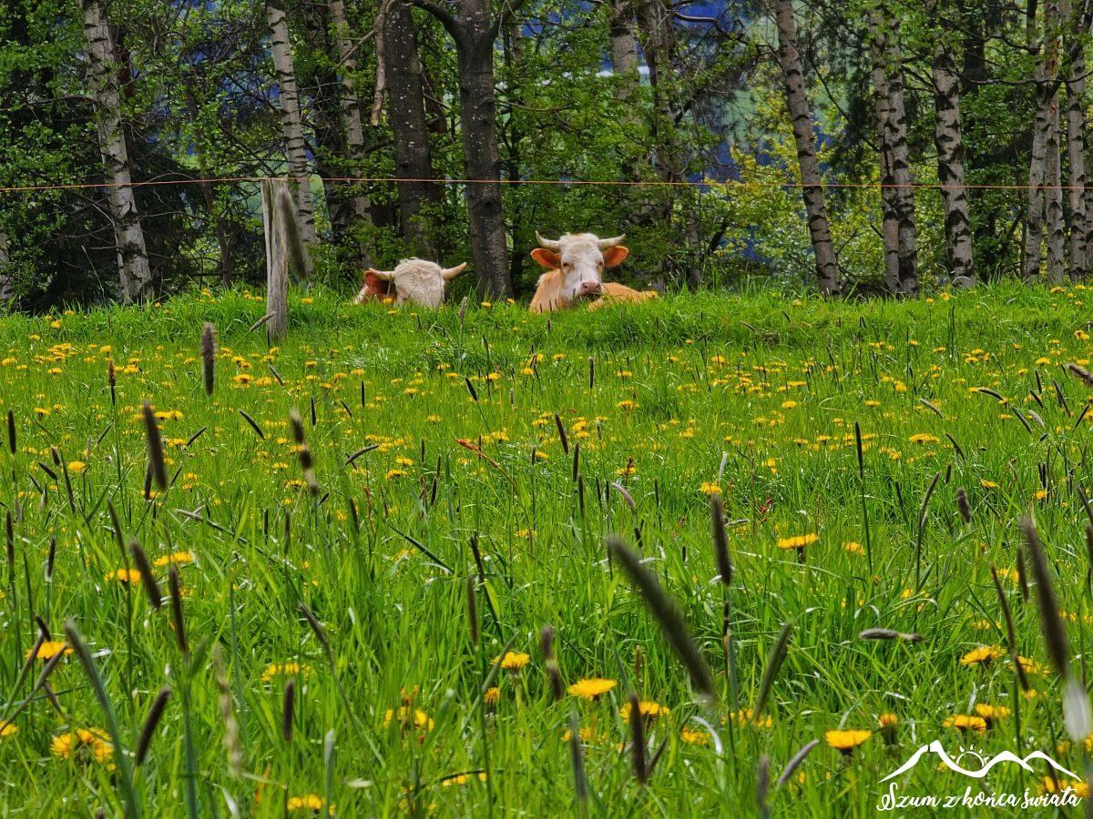 W końcu odbijamy na polną drogę i, w towarzystwie bacznych spojrzeń pasących się krów, wędrujemy w kierunku Olszówki. Idylla nie trwa długo, bo już po chwili znowu jesteśmy na asfalcie. Do tego trwa remont drogi, jest więc głośno i brudno. Sytuację ratuje las i wiosennie kwitnące przydrożne drzewa i krzewy.