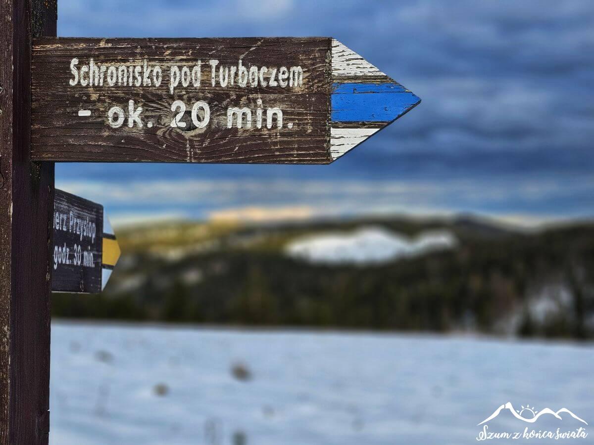 Początkowo szlak jest suchy, jednak dobijając do granicy 1000 metrów spotykamy śnieg, a raczej śnieg walczący z błotem. Idzie się ciężko, ale wizja ciepłego posiłku i zimnego piwerka pcha nasze nogi coraz wyżej i wyżej… Zdobywamy w końcu Czoło Turbacza (1259 m n.p.m.), po którym pozostaje już tylko wędrówka rozległą Halą Turbacz. Już tutaj widoki są zjawiskowe, a co dopiero przy samym schronisku… To właśnie przy nim znajduje się chyba najbardziej fotogeniczny szlakowskaz w całych Beskidach. Ale chyba nie ma czemu się dziwić.